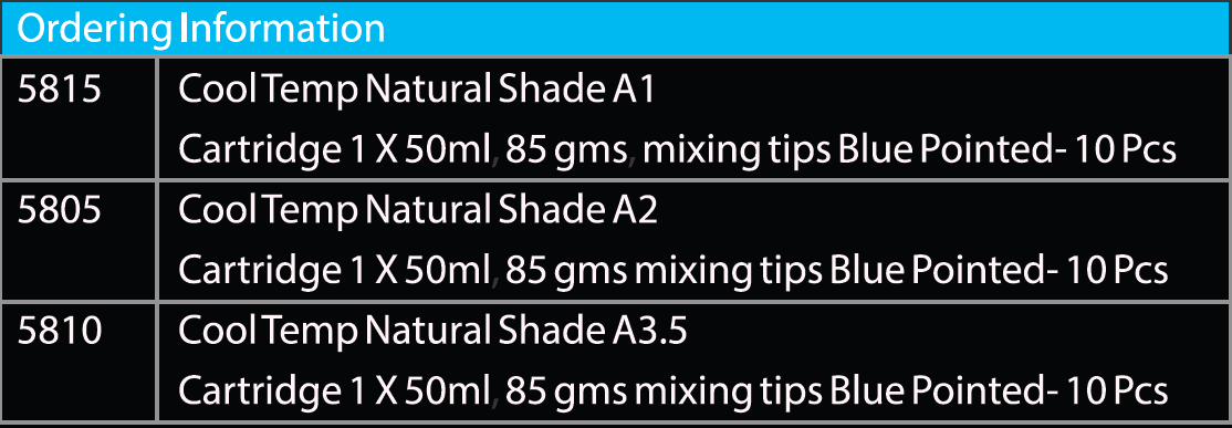 Non–exothermic: low curing temperature- comfortable to patient. Automix: User friendly and time saving Accurate provisional: Easy to trim and polish Optimum strength Natural aesthetics and optimum color stability. Reaches firm- elastic consistency in 35-40 seconds when it can be easily taken out of the mouth. Keep in the provisional impression for 4 minutes to allow complete polymerisation.