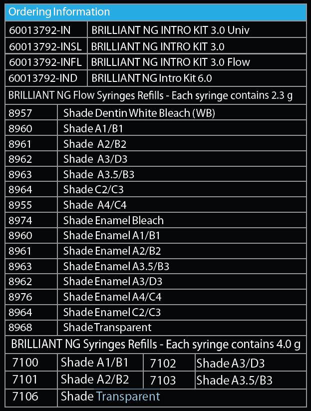 simplifying the selection of colour and inventory of syringes. Owing to its optimized particle distribution, BRILLIANT NG is indicated both for the anterior