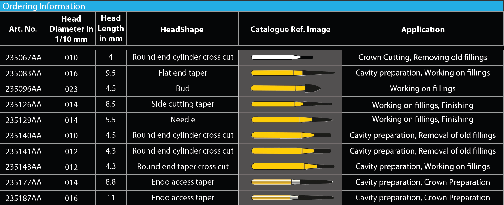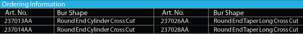 Advanced designs and aggressive rake angles provide the means to create a longer lasting, concentric, smoother cutting instrument that rapidly reduces materials such as amalgam, gold, porcelain, enamel and PFM 100